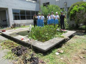 鯉も泳いでいる観察池の水質が悪化している状態を見かねた創作部の部員が中心となり、大掃除の奉仕活動をしてくれました。観察池では、最近鯉の稚魚が生まれており、繁殖が起きていることが分かりました。生徒たちは鯉をとてもかわいがっており、環境を良くしたいと以前から気にかけてくれていました。この日は茂りすぎた水草を間引いたり、底にたまったヘドロ状の汚れをすくいとったりしてくれました。