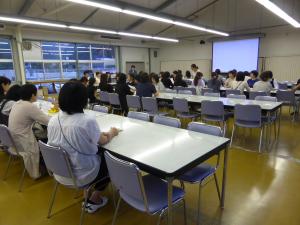 PTA生活安全部が中心となり、中学校のランチルームで一斉に行いました。前半は、生徒たちの学校生活の様子や生活習慣アンケートの結果等をお知らせしました。後半は、各地区に分かれて、家庭学習等について懇談をしていただきました。